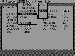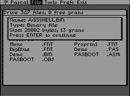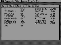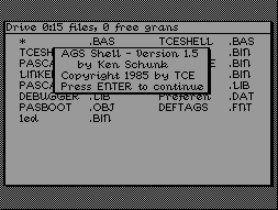 | The AGS shell program always opened up a directory of Drive 0. It had functions to allow executing parts of the DEFT Pascal pacakage. It could view directories, allowing executing and deleting of files (but no rename - go figure). |   |