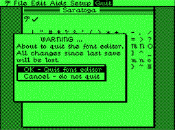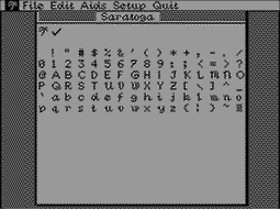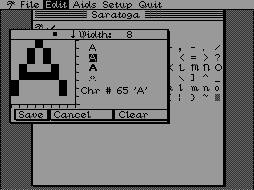 | The AGS graphics package included a font editor I designed. The first font I had to hard code, but the rest I used the editor to create. Here you see the main screen of the editor, showing all of the available characters in a font. I patterend the "Saratoga" font after the Palo-Alto font I saw in Byte magazine - the font used by PARC. Why Saratoga? That's where I was living - Saratoga Springs, NY. |   |