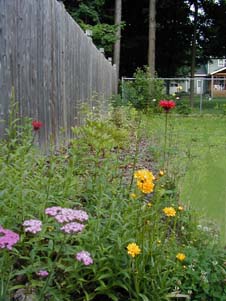 Here is the same fence, looking towards the back. Pink, yellow and red are what I see - how about you? In the background is the pussy willow planted to fill in the corner, with lilies in front of it. | ![]() |
