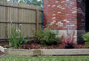 | Once the back was done we moved on to the other side of the house. This side was originally just bare concrete and sand. This side gets a good amount of sun, and flowers here include pink ones, blue ones, and even some yellow ones. Look, new mulch! | ![]() |