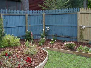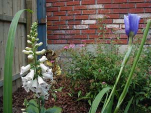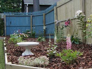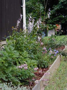 The first section of garden was created when our neighbors erected a fence for their new pool. The long wooden backdrop of the fence made a perfect place to start a flower garden. This shot is looking towards the front of the fence. Flowers visible here include blue ones, pink ones and white ones. |