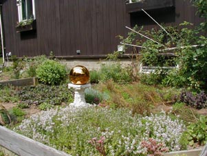 The next section of garden was created behind the house. Wooden frames were extended from the house for the strawberry patch (in the far section of the photo) and the perennial garden. The original garden only came back half of this distance - it was expanded a year later. Just in front of the foreground is a corner of Hen's and Chicks. At the right edge is a climbing rose. |