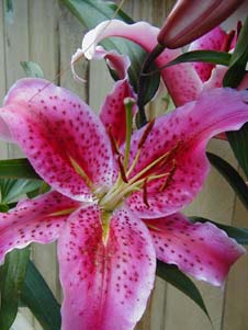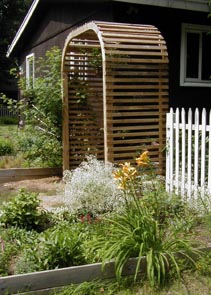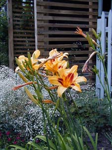 On the right is the other section of back garden. In the foreground are lilies, babies breath and other green things. In the center our wooden archway leads from the path onto our back patio. On the left is a close-up of the lily and the babies breath. A small clematis can be seen in the back starting it's way up the archway. | ![]() |