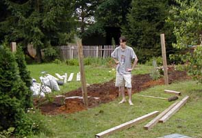 Oh yeah, Neil looks happy. We've just started on our new section in this photo. After tilling with the misnamed "Merry Tiller" (and let me say that their was NOTHING very merry about that thing) we've raked and planted the first few flowers. We've also planted the first few poles for the fence to divide this section from the front yard. Three days later brings us to... |
